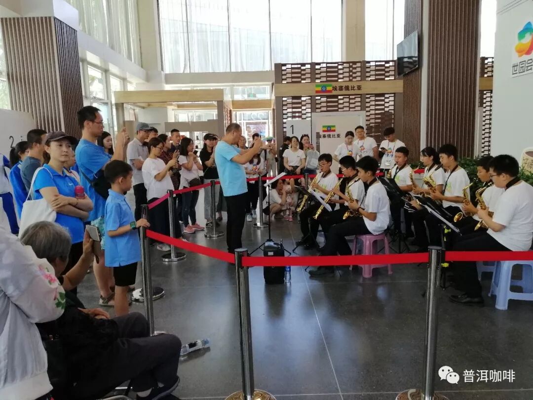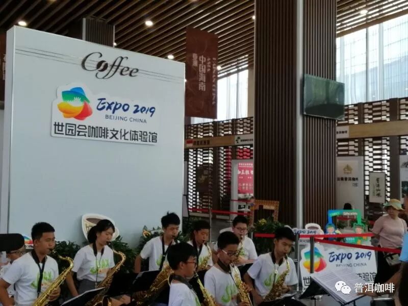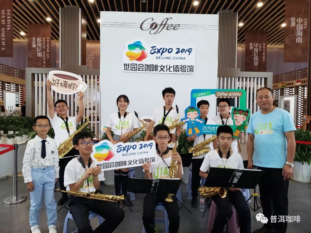 6月9日,来自花童萨克斯乐队的八位小朋友来到北京世园会的咖啡文化体验馆,为宣传普洱咖啡助力。