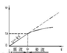 粗颗粒土(如砾、卵石等)的试验, 由于其孔隙很大,当水力梯度较大时,流速增大,渗流将过渡为不规则的相互混杂的流动形式——紊流,这时v-i关系呈非线性变化, 达西定律不再适用。