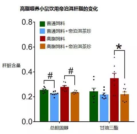在人体实验中,13名男性健康受试者进行一周的标准饮食,之后每天饮用3g帝泊洱普洱茶茶珍,持续4周,结果发现胆固醇和甘油三酯水平显著降低。动物实验也发现了类似的结果。
